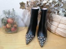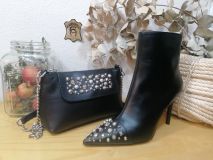 Botín de mujer Sandar de Lodi en piel lisa de color negro. Destaca el detalle de puntera con tachas en metal plateado. Dispone de un tacón fino de 9,5 cm de altura. Cierre mediante cremallera lateral. Interior forrado en piel. Incluye planta de new gel para mayor comodidad en tus pisadas. Fabricado en España.